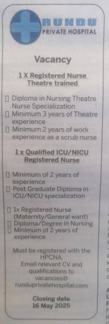 Rundu Private Hospital Vacancies 2025 New Job Advertisement Published for Registered Nurse Theatre trained, Qualified ICU/NICU Registered Nurse Posts